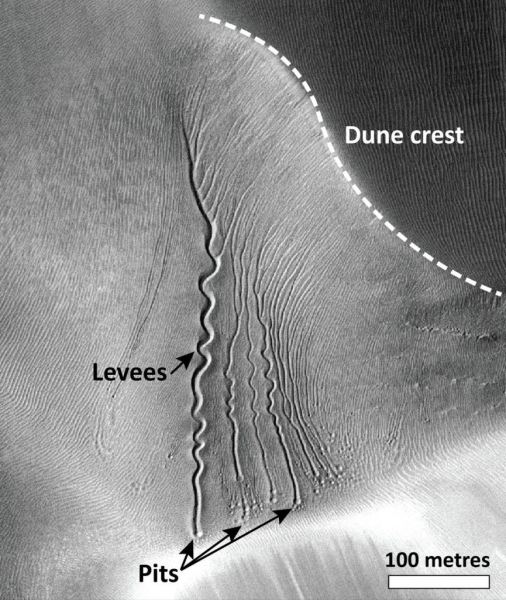 Марсианские дюны покрыты узкими извилистыми оврагами. Они выглядят свежевырытыми, с поднятыми краями, но вода на современной Красной планете слишком редка, чтобы их образовать.