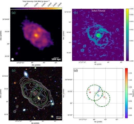(а) Радиоизображение на частоте 144 МГц с угловым разрешением 6 угловых секунд RAD J131346.9+500320, (б): Радиокарта RAD J131346.9+500320, улучшенная по краям; (c) радиоконтуры LoTSS на частоте 144 МГц с разрешением 6 угловых секунд в белом цвете, наложенным на оптическое изображение в нижнем диапазоне частот. Двумя зелеными кружками выделены кольца; голубыми пунктирными кружками отмечены галактики с одинаковыми красными смещениями; (d) То же, что и (c), но галактики обозначены красным смещением (см. цветную полосу). Два больших пунктирных зеленых круга обозначают кольца.